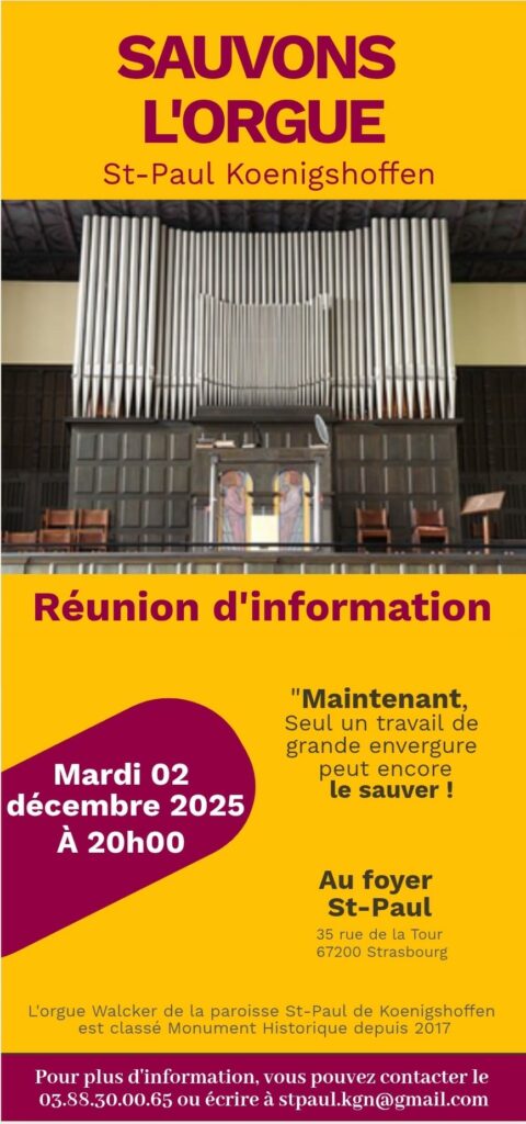 Il est indispensable de monter une commission ORGUE pour faire avancer les travaux. Une première réunion aura lieu mardi 2 décembre 2025 à 20h dans le Hall d’entrée du Foyer Saint-Paul. Toutes les compétences, toutes les imaginations, toutes les idées pour lever des fonds, seront les bienvenues !